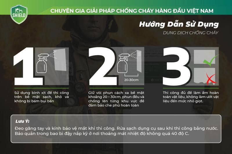 Dung dịch chống cháy của KH Shield, trong suốt, không mùi, an toàn và thân thiện với môi trường dùng để chống cháy cho các loại vải, rèm và thảm. Đặc biệt không ảnh hưởng đến cảm giác của sợi vải, thảm; không độc hại và không gây kích ứng da. Vải sau khi được xử lý sẽ đạt yêu cầu chống cháy theo QCVN 06:2022/BXD.