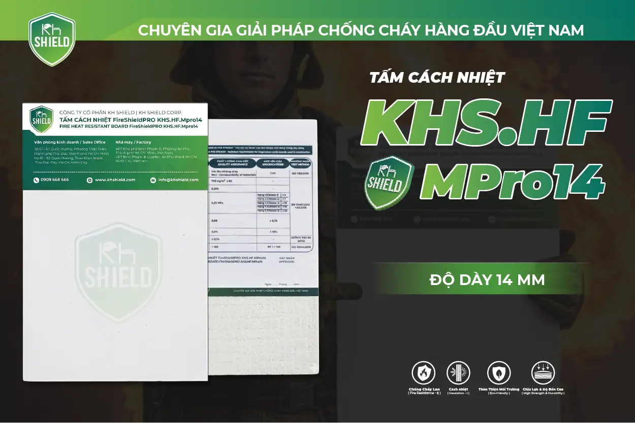 KHS.HF.MPro14 đã được phát triển từ tấm KHS.HF.M với việc ứng dụng công nghệ FireShieldPRO® độc quyền. Sản phẩm mang đến khả năng chống cháy và cách nhiệt hiệu quả hơn. Nhờ hiệu năng cao sản phẩm có thể giảm độ dày tấm từ đó giảm độ dày kết cấu, mở rộng không gian sử dụng và nâng cao hiệu quả thi công. Với độ giãn nở ẩm chỉ 0.01%. Việc thử nghiệm 25 chu kỳ tương đương 500 giờ ngâm nước và sấy khô, vật liệu vẫn giữ được gần 90% cường độ, gần như không biến dạng, cong vênh hay nứt gãy.