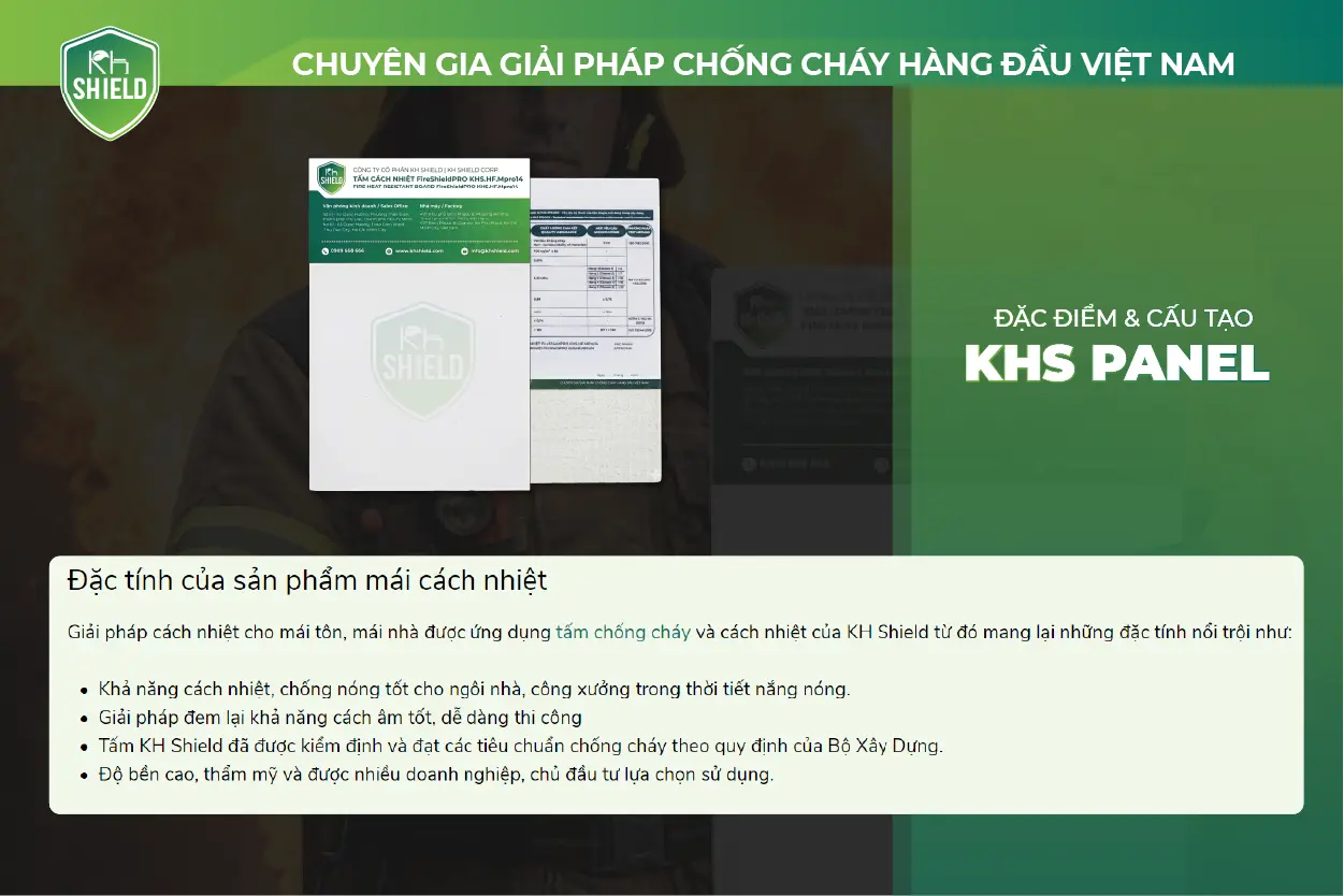 - Tấm KH Shield đã được kiểm định và đạt các tiêu chuẩn chống cháy theo quy định của Bộ Xây Dựng.
